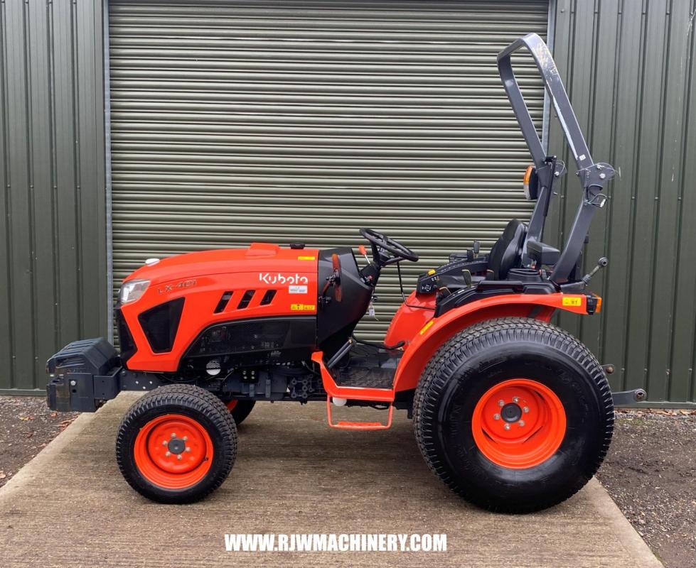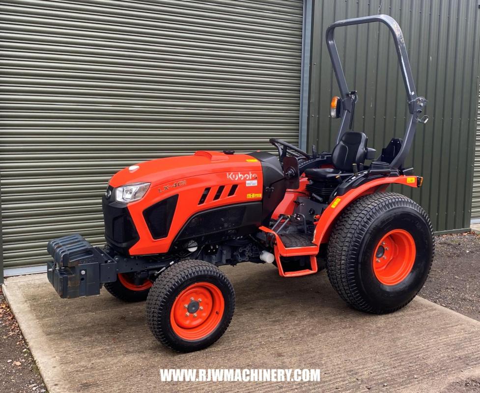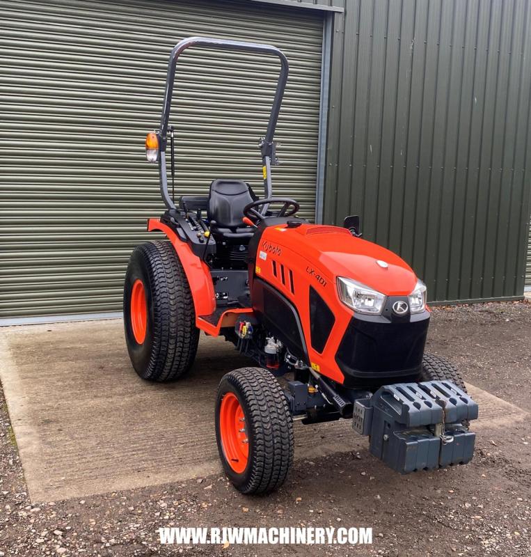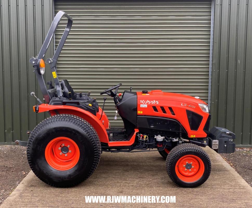 Kubota LX-401 compact tractor, year 2022 ~ 674hrs, 40hp 4 cylinder Kubota diesel engine c/w exhaust gas recirculation and particulate filter which conforms with EU stage V standard, 3 range hydrostatic drive transmission, auto - throttle, Bi - speed steering, PAS, ROPS, selectable 2/4 wheel drive, 540/540E rear PTO, mid PTO, rear mounted external PTO control for implements when stationary, cruise control, CAT 1 rear linkage, rear lift capacity 1150kg, front weights, 2 double acting rear hydraulic spool valves, turf tyres, piped loader ready. £16,950 + VAT