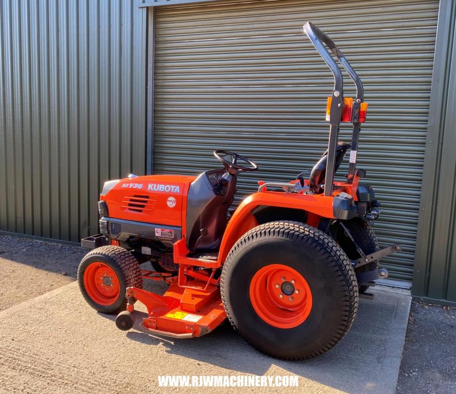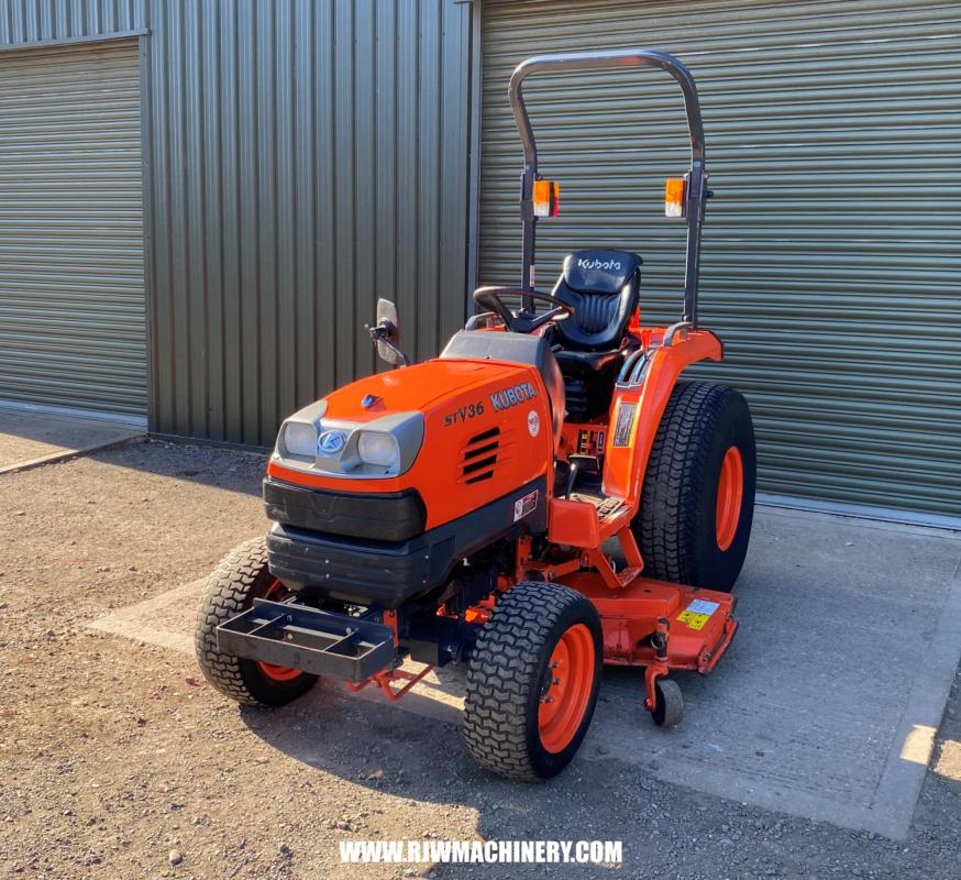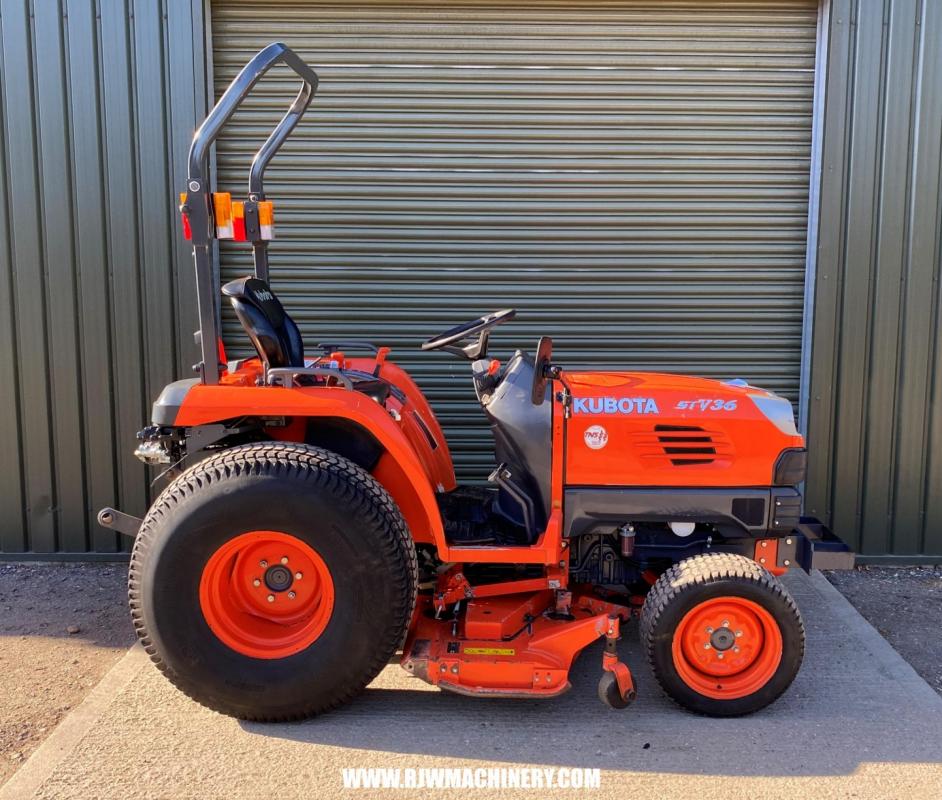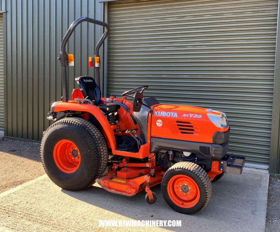 Kubota STV36 Compact tractor, year 2014 ~ 2666hrs, 36hp, 3 cylinder Kubota diesel engine,, 3 range hydrostatic drive transmission, Bi speed turning, cruise control, auto throttle, 4w/d, ROPS, PAS, Cat 1 rear 3 point linkage, rear linkage lift capacity 1149kg, 540rpm rear PTO & 2500rpm mid PTO, 2 x double acting spools, 60" rear discharge mid mount deck, turf tyres. £9,750 + VAT
