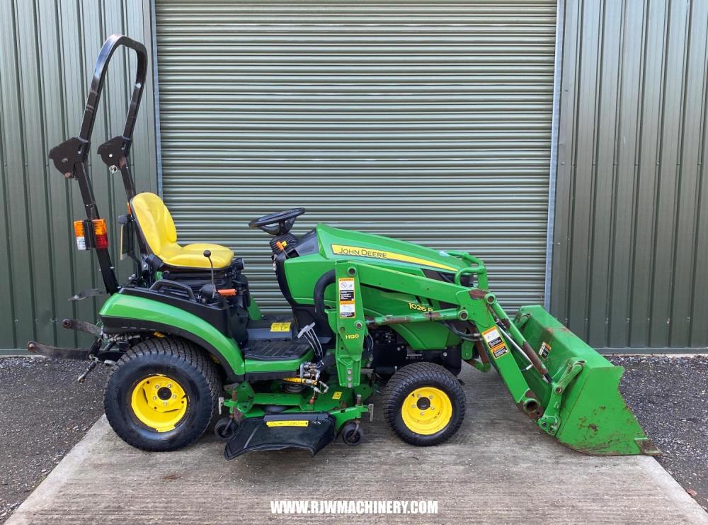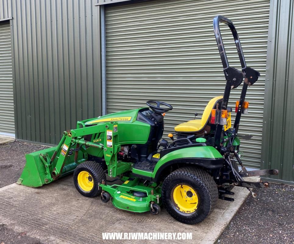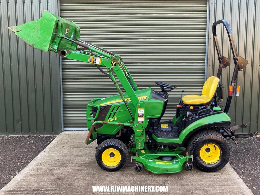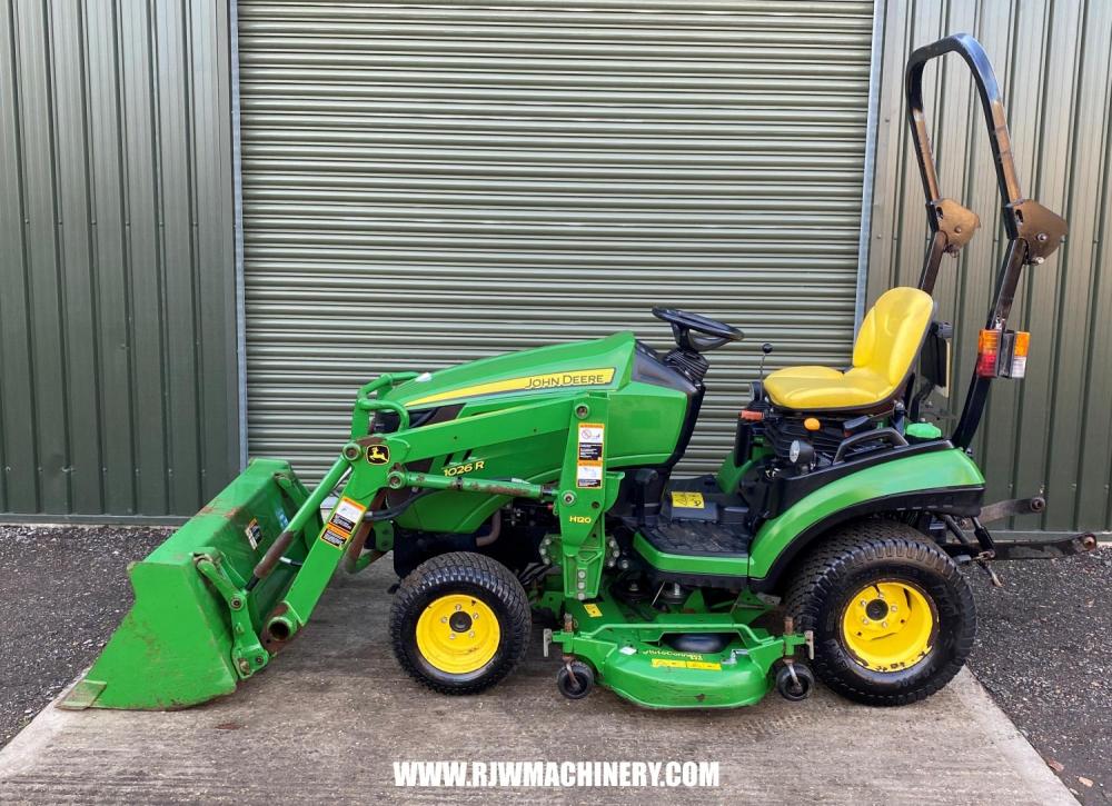 SOLD SOLD SOLD John Deere 1026R Compact Tractor, year 2014 - 840 hrs, 24hp, 3 cylinder Yanmar diesel engine, 2 range hydrostatic drive transmission, PAS, ROPS, 4 wheel drive, cruise control, mid & rear PTO, CAT 1 rear 3 point linkage, rear lift capacity at ball ends 525kg, John Deere 120R front loader, c/w bucket, 54" side discharge mid mount deck, road registered. £12,950 + VAT