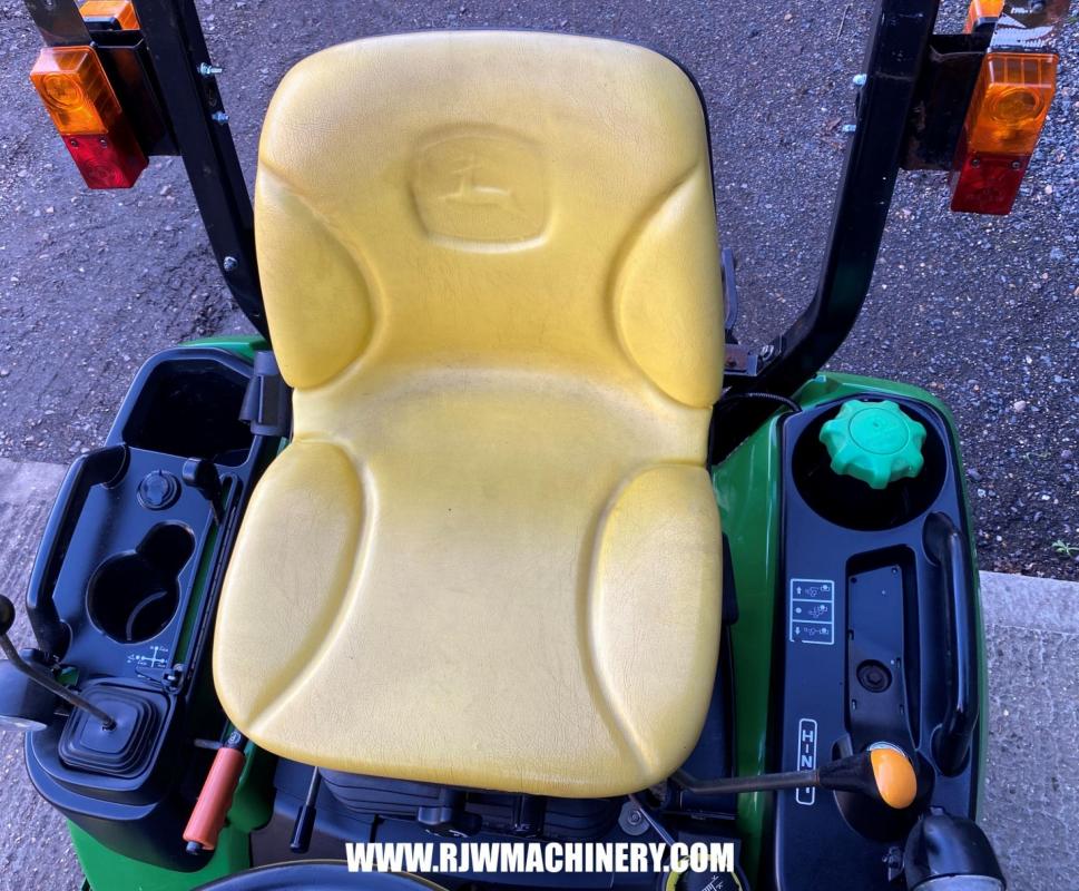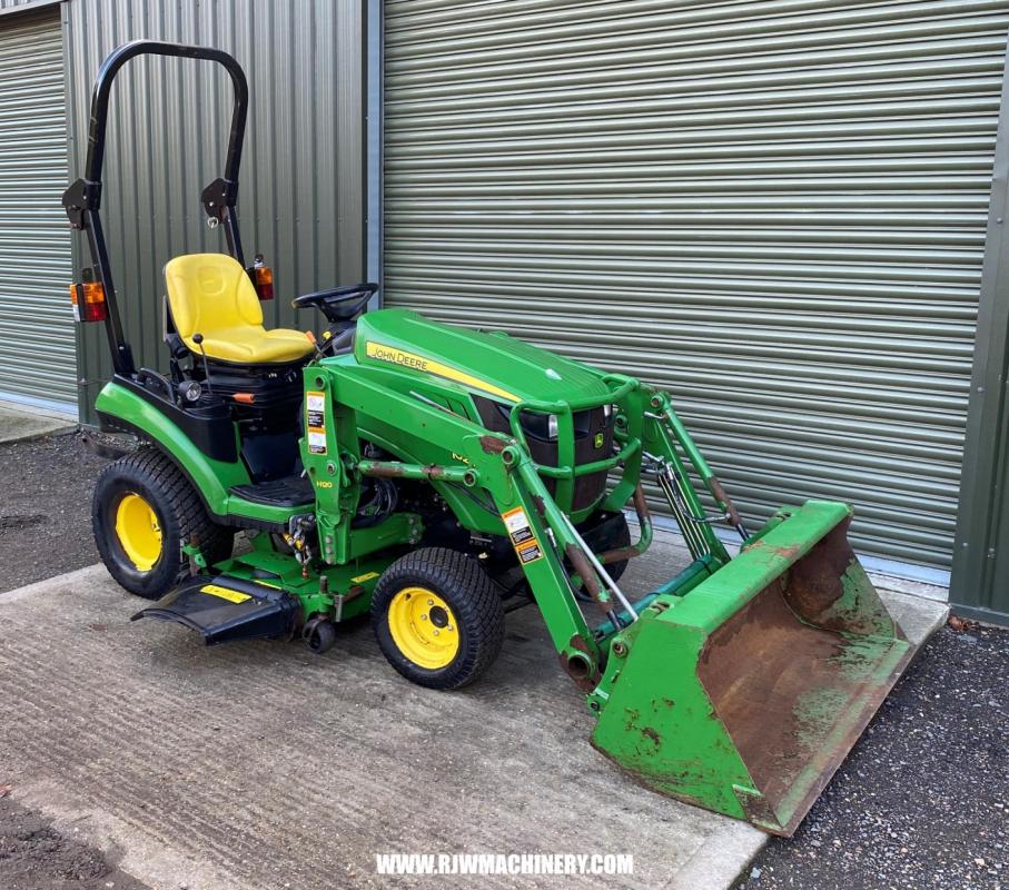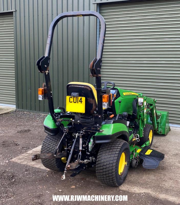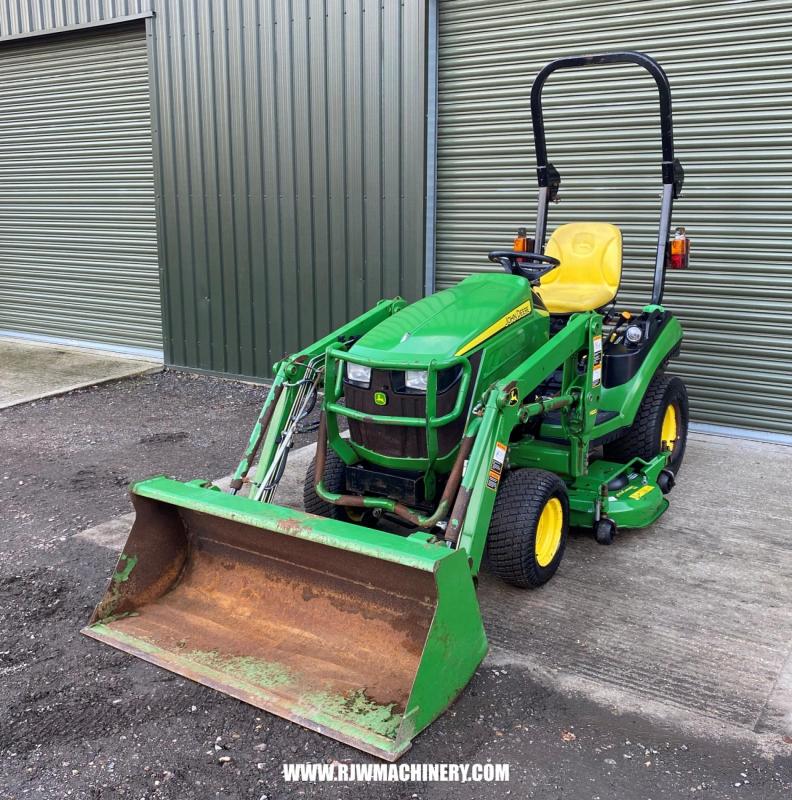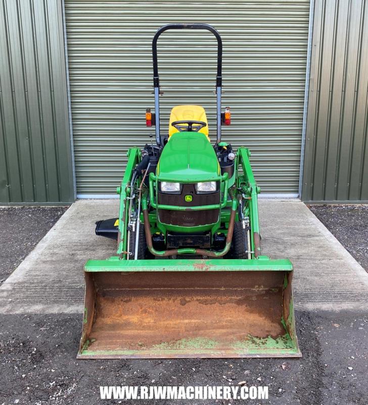 SOLD SOLD SOLD John Deere 1026R Compact Tractor, year 2014 - 840 hrs, 24hp, 3 cylinder Yanmar diesel engine, 2 range hydrostatic drive transmission, PAS, ROPS, 4 wheel drive, cruise control, mid & rear PTO, CAT 1 rear 3 point linkage, rear lift capacity at ball ends 525kg, John Deere 120R front loader, c/w bucket, 54" side discharge mid mount deck, road registered. £12,950 + VAT