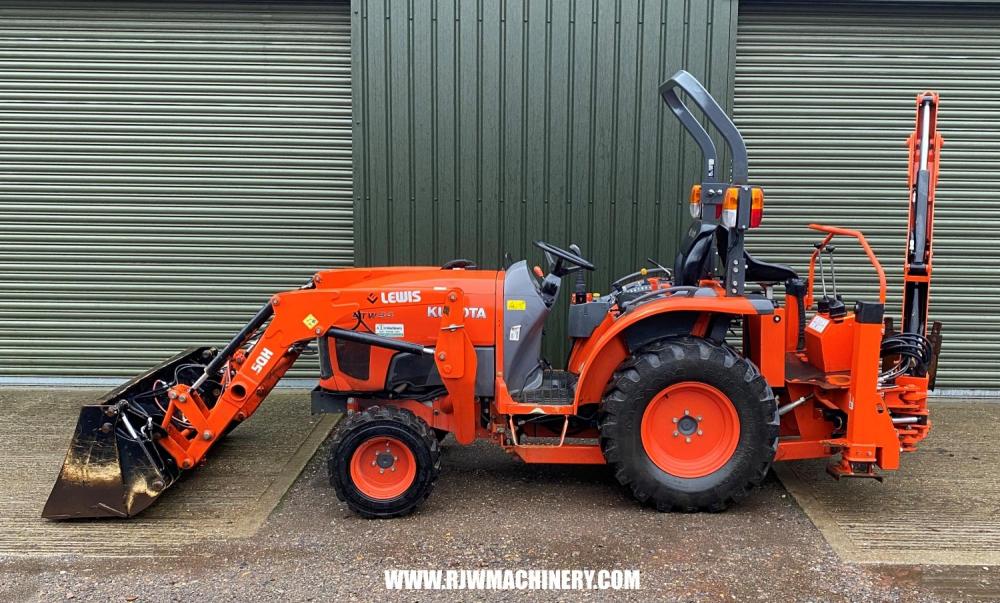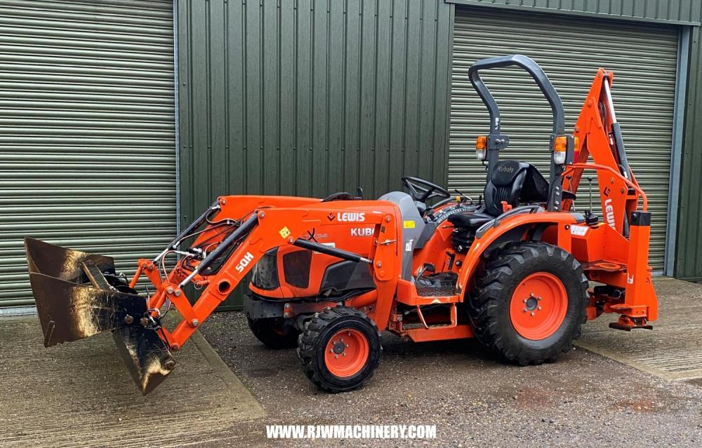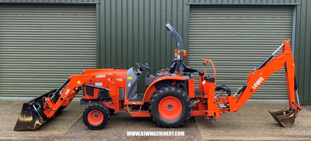 SOLD SOLD SOLD Kubota STW34 compact tractor, year 2016 ~ 2188hrs, 33hp Kubota 3 cylinder diesel engine, 3 range hydrostatic drive transmission, 34km/h transport speed, cruise control, Bi-speed turning, selectable 2/4 wheel drive, PAS, ROPS, 540rpm rear PTO, 2500rpm mid PTO, rear hydraulic spool valves, Lewis 25Q front loader c/w 4/1 bucket, Lewis 320S rear frame mounted backhoe. road registered. (awaiting Prep) £16,500 + VAT